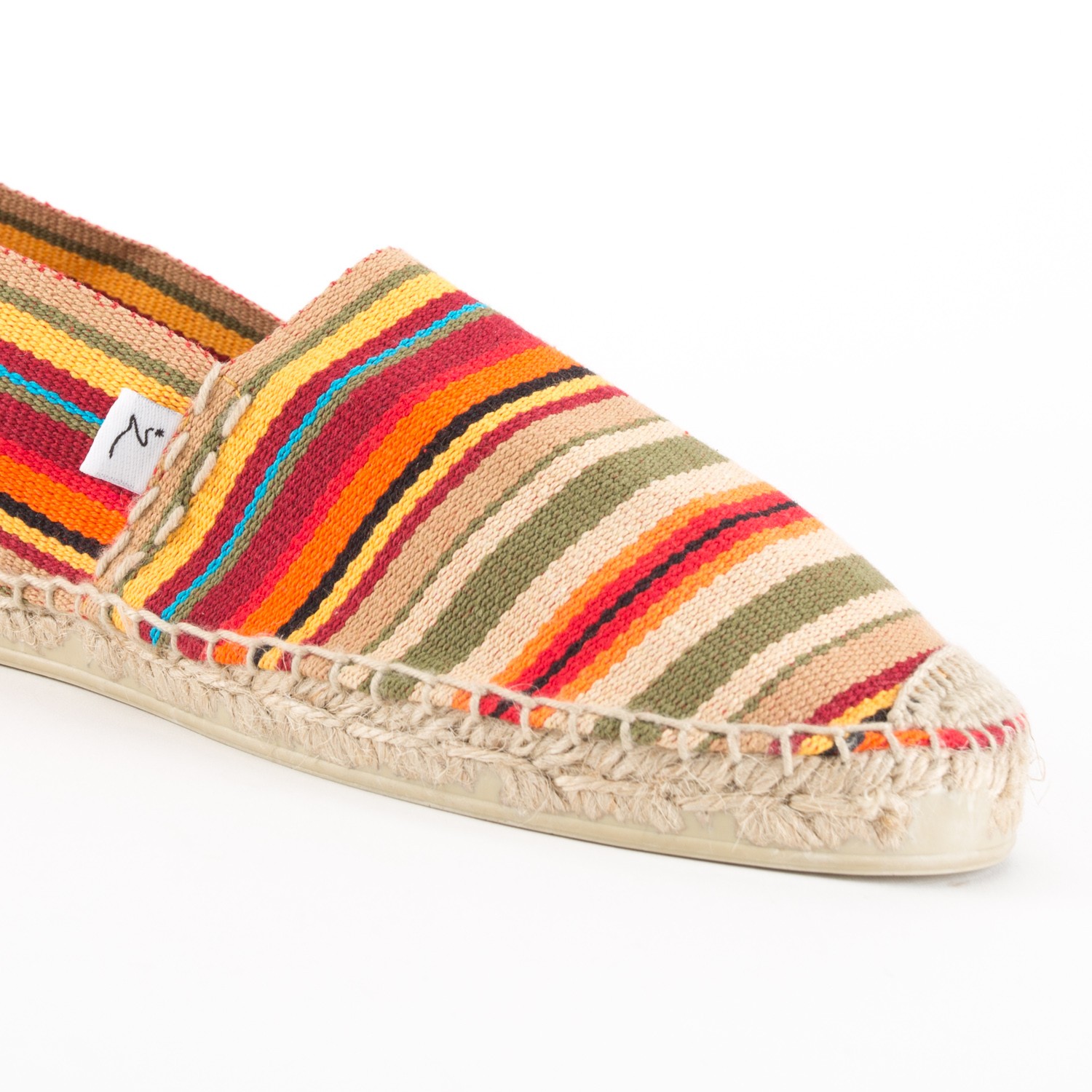 This traditionaly handmade espadrille striped with red-yellow-orange bands evokes thoughts of the most beautiful summer scenarios. Perfect for beach, pool, car, or around town. Organic, super comfortable and easy to wear.